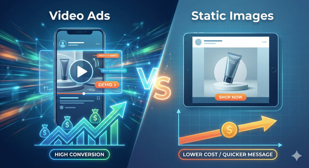 When analyzing Video Ads vs Static Images, the data usually shows a clear trend: